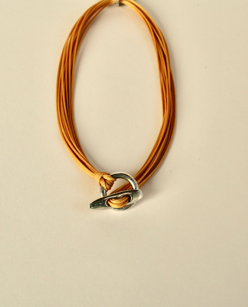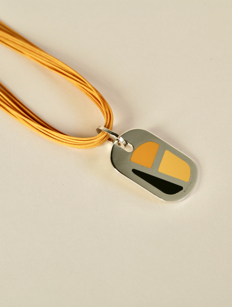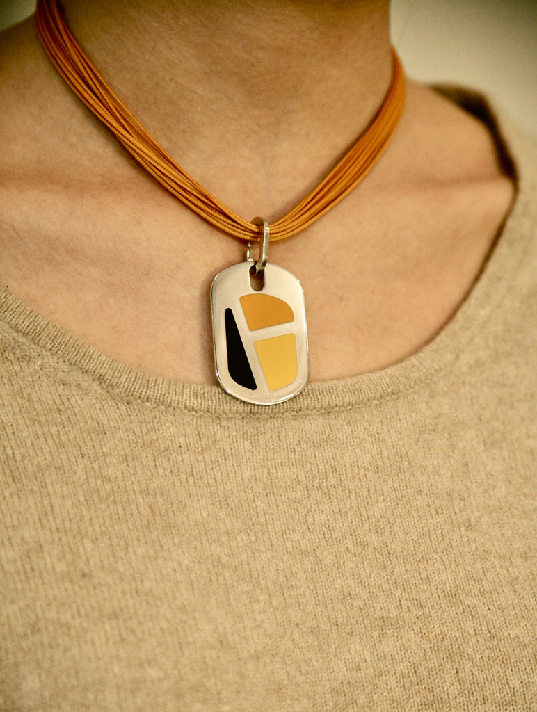 Elegant 925 silver pendant in a rectangular plate shape with rounded corners, enhanced with enamel in warm shades of yellow, orange, and brown, applied in distinct areas for a vibrant color effect. Paired with a multi-strand necklace in mandarin color, the piece is finished with a silver T-bar clasp, stylish and secure.