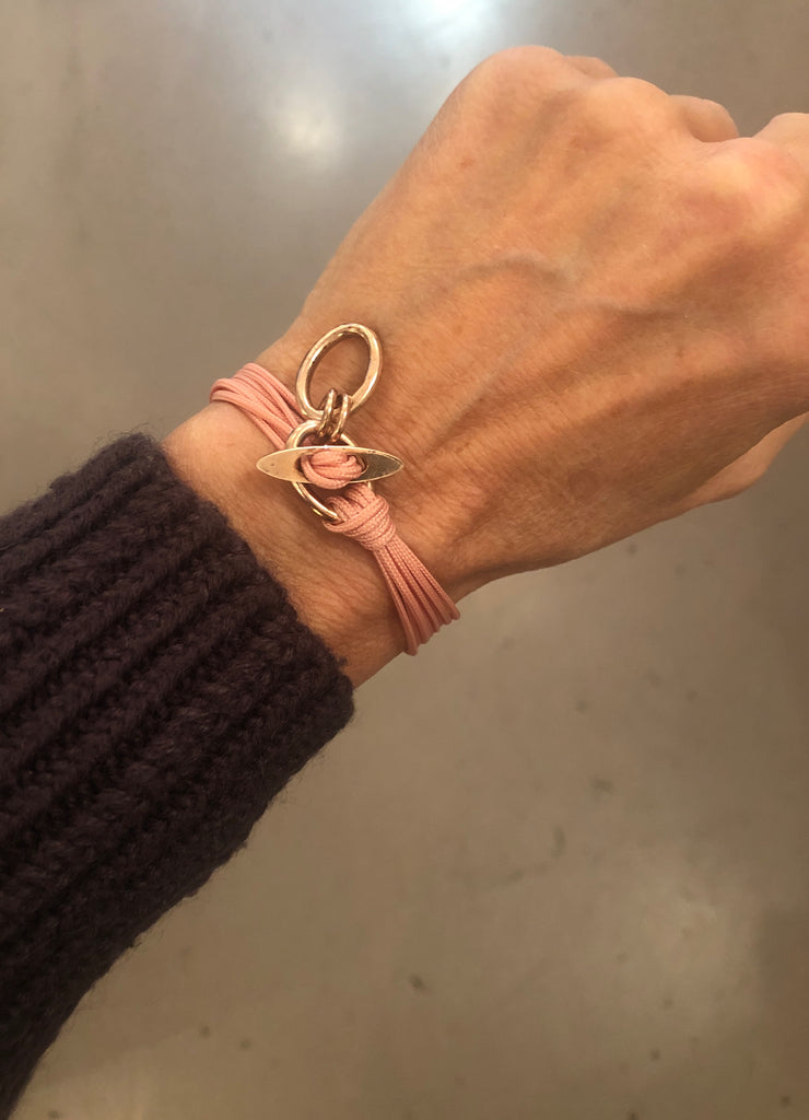 Minimal elegance meets contemporary style in Rosé Oval Circle, a multi-strand bracelet that delicately wraps around a refined rose gold-plated silver oval circle. The round T-bar closure is not only functional but also serves as a jewelry-like detail, adding a chic and sophisticated touch. Perfect to wear alone for a minimalist effect or layered with other bracelets for a more personal and modern look.