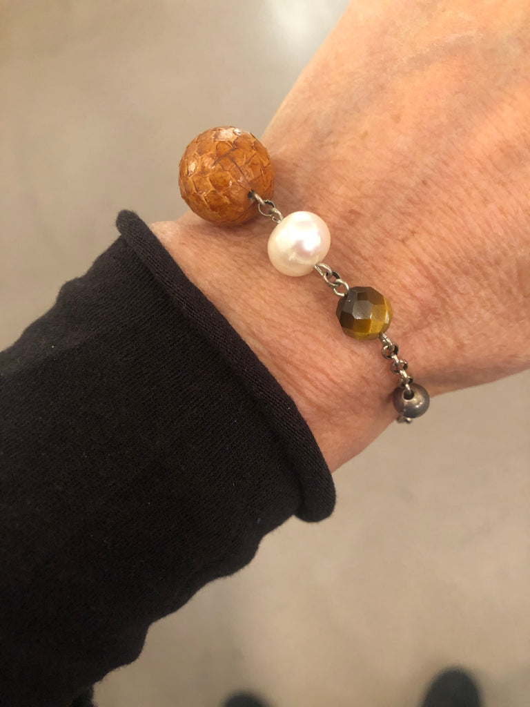 Material: sterling silver, fresh water pearl, leather, tiger's eye stone