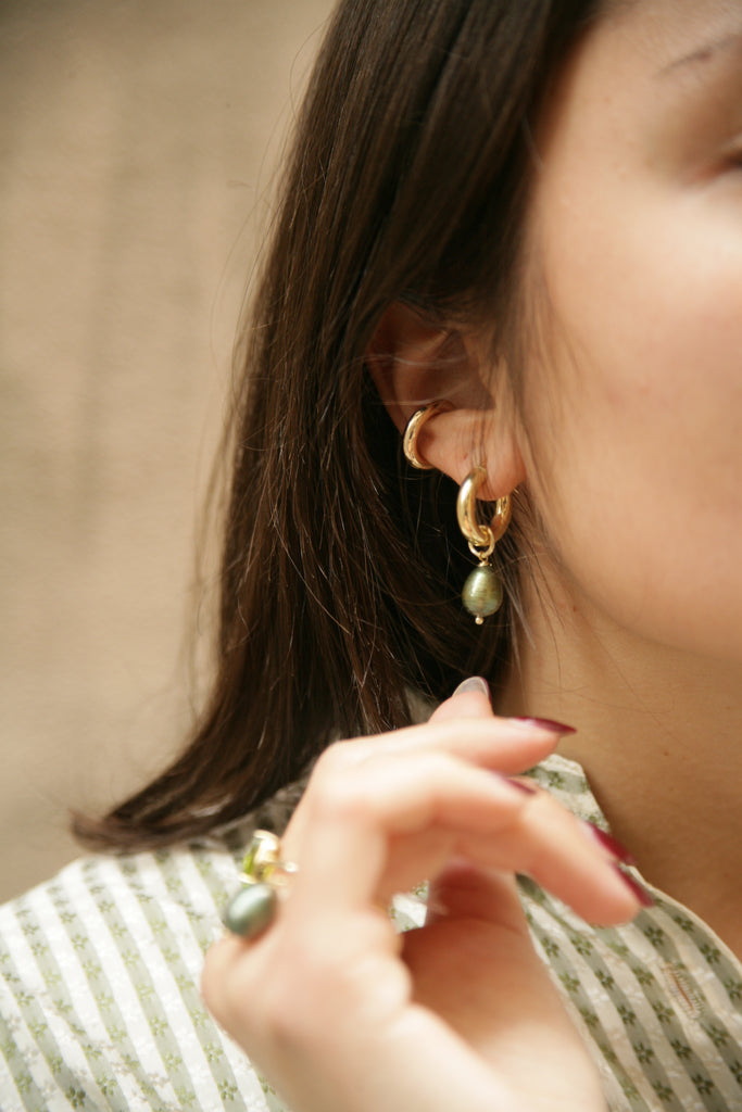 Crafted from gold-plated 925 sterling silver, these hoop earrings combine clean lines with a warm golden glow, enhanced by the authentic charm of olive green freshwater pearls.Each pearl, approximately 12 mm long, features a slightly irregular shape — a mark of its natural origin and unique character.