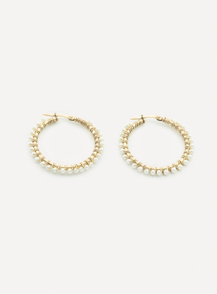 Elegant and timeless, the Luna earrings embody the delicacy and natural glow of pearls. Their circular profile is entirely adorned with small white pearls, carefully threaded onto a gold-plated silver wire that radiates a warm, sophisticated sheen.