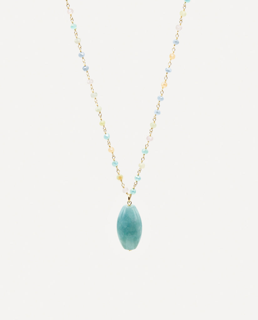 A delicate and luminous necklace that combines elegance and color in a refined design. The faceted multicolor pastel beads catch the light with soft, harmonious shades, while the aquamarine/sea green agate pendant adds a natural and sophisticated touch.