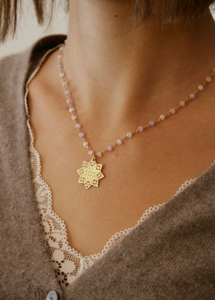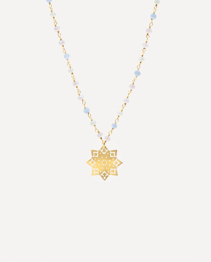 Porta con te armonia e luce con la collana Veda, realizzata con la tecnica del rosario e pietrine sfaccettate nei delicati colori pastello rosa e azzurro, che catturano la luce ad ogni movimento. Il pendente, una stella a 8 punte in argento placcato oro 18 ct, richiama equilibrio, spiritualità e connessione con l’energia universale.