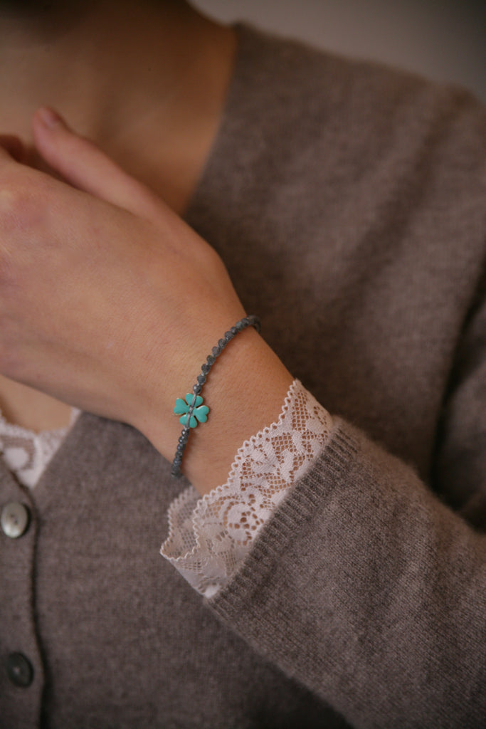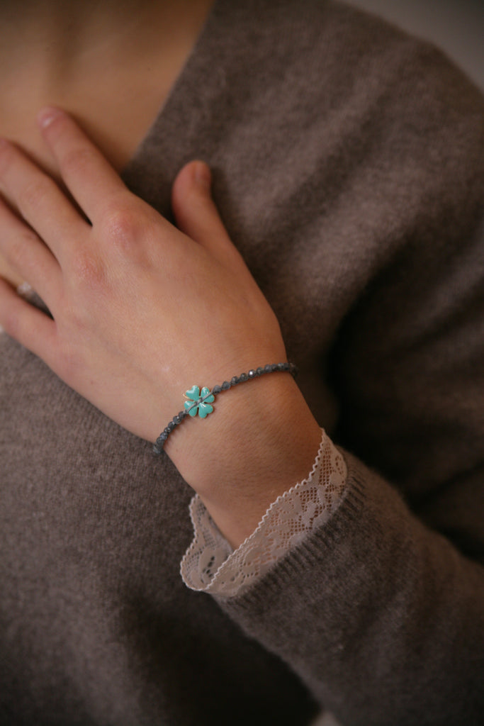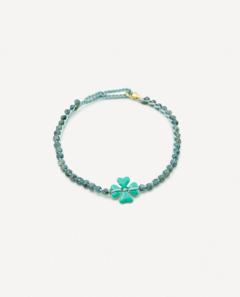 Made with a delicate polyester thread handwoven using the crochet technique, it features at its center a four-leaf clover in gold-plated sterling silver, finished with a refined aqua-green enamel.